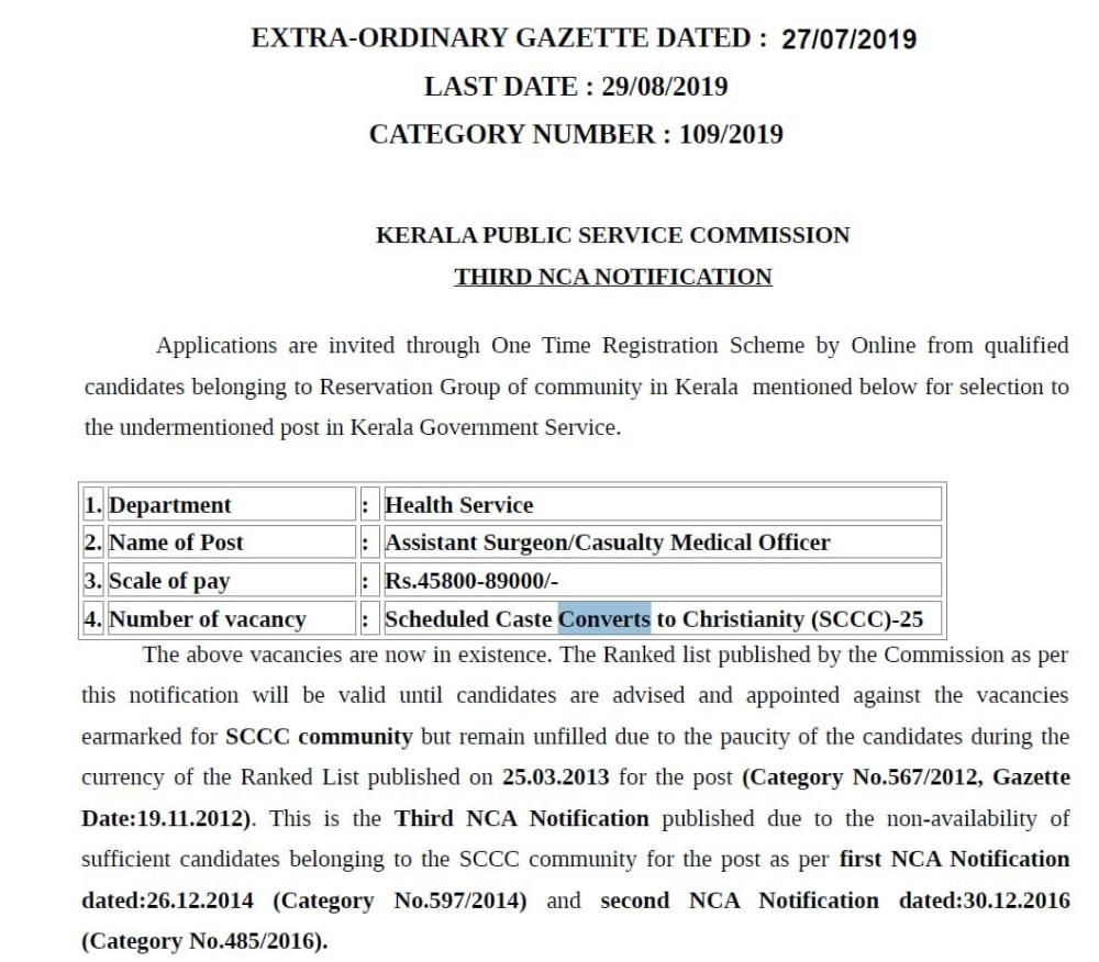 - Kerala Govt. Service Vacancy for Christian converts from SC