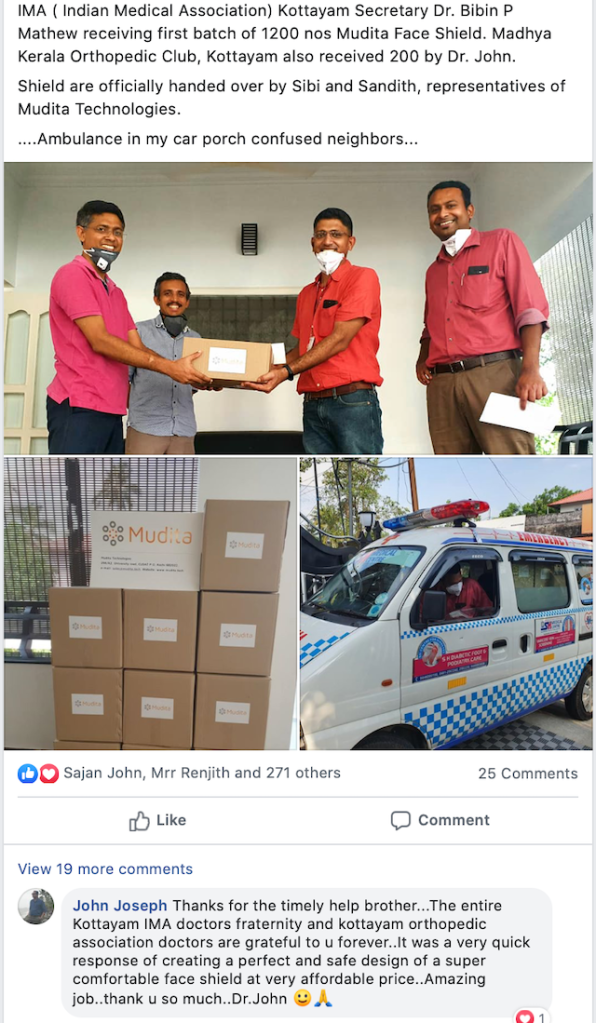 3-D printing has lot limitations in terms of material quality, finish of the product, durability and most importantly speed of production. To create a much bigger impact and in line with the belief that bigger sutainable impact is making it commercial, the whole project is now under Mudita Technologies. The first production batch of improved design, Ver 7, was be delivered on 1st May to Indian Medical Association. There is great feedback from them.