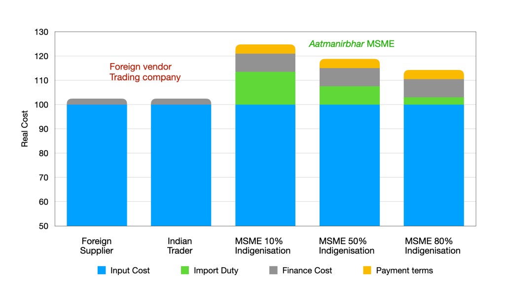 In the example of the above product with six month timeline for product delivery, there is a three months difference in timeline between payment to a foreign vendor / Indian trading company versus an MSME manufacturer.