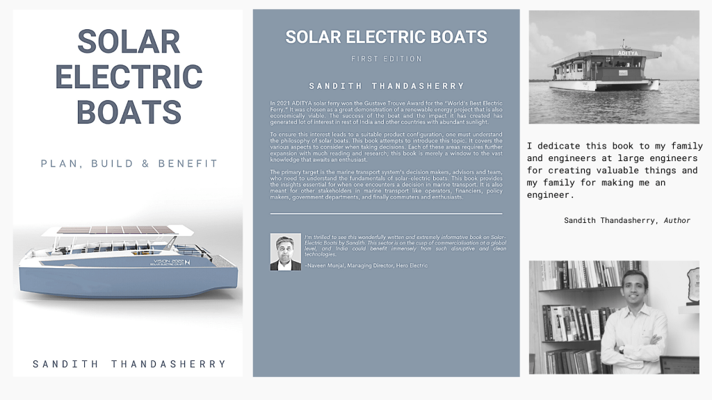 When I look back to why I decided to write the book, I can think of four reasons. The first was that right from when I set out to make our first solar boat in 2009; there was not much reference material in books or other resources to provide insights and proper guidance. Not much has changed in the last twelve years. The second reason is that since the launch of ADITYA, I have interacted with many decision-makers and enthusiasts. I felt that if I could convey the lessons, we learned over the years in a business language to them, then there is a good chance of improving the adoption of solar ferries.