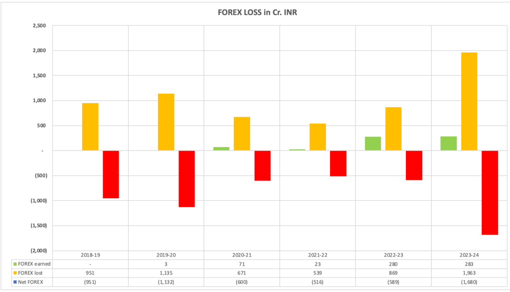 The Indian government could gain valuable insights by examining publicly available data on foreign currency losses incurred by large shipyards. For example, CSL’s annual reports from the last six years reveal staggering losses totaling ₹5,813 crore (over $700 million USD) in foreign exchange transactions: