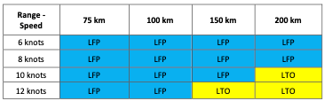 - High speed (>15 knots), high range (>150 km)