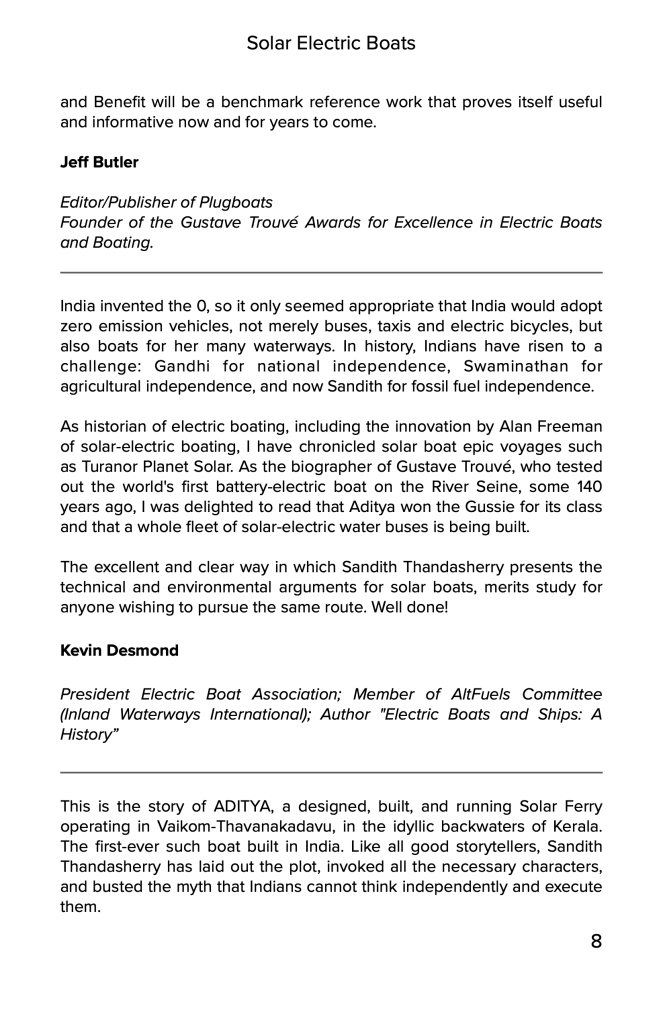 “I was delighted to read that Aditya won the Gussie for its class and that a whole fleet of solar-electric water buses is being built. The excellent and clear way in which Sandith Thandasherry presents the technical and environmental arguments for solar boats, merits study for anyone wishing to pursue the same route. Well done!“