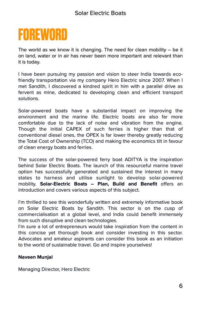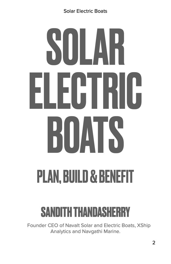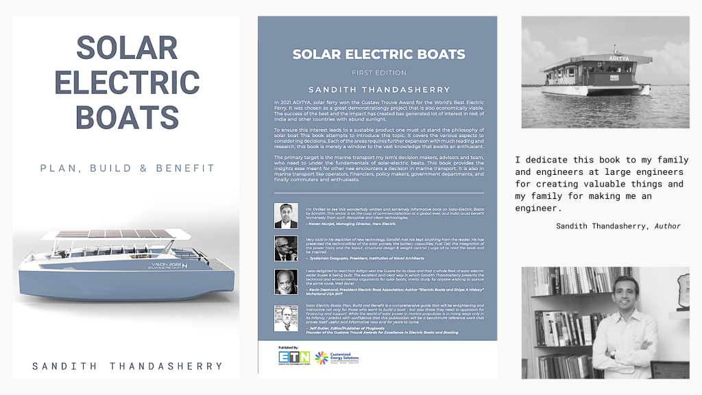 “I’m thrilled to see this wonderfully written and extremely informative book on Solar-Electric Boats by Sandith. This sector is on the cusp of commercialisation at a global level, and India could benefit immensely from such disruptive and clean technologies.”